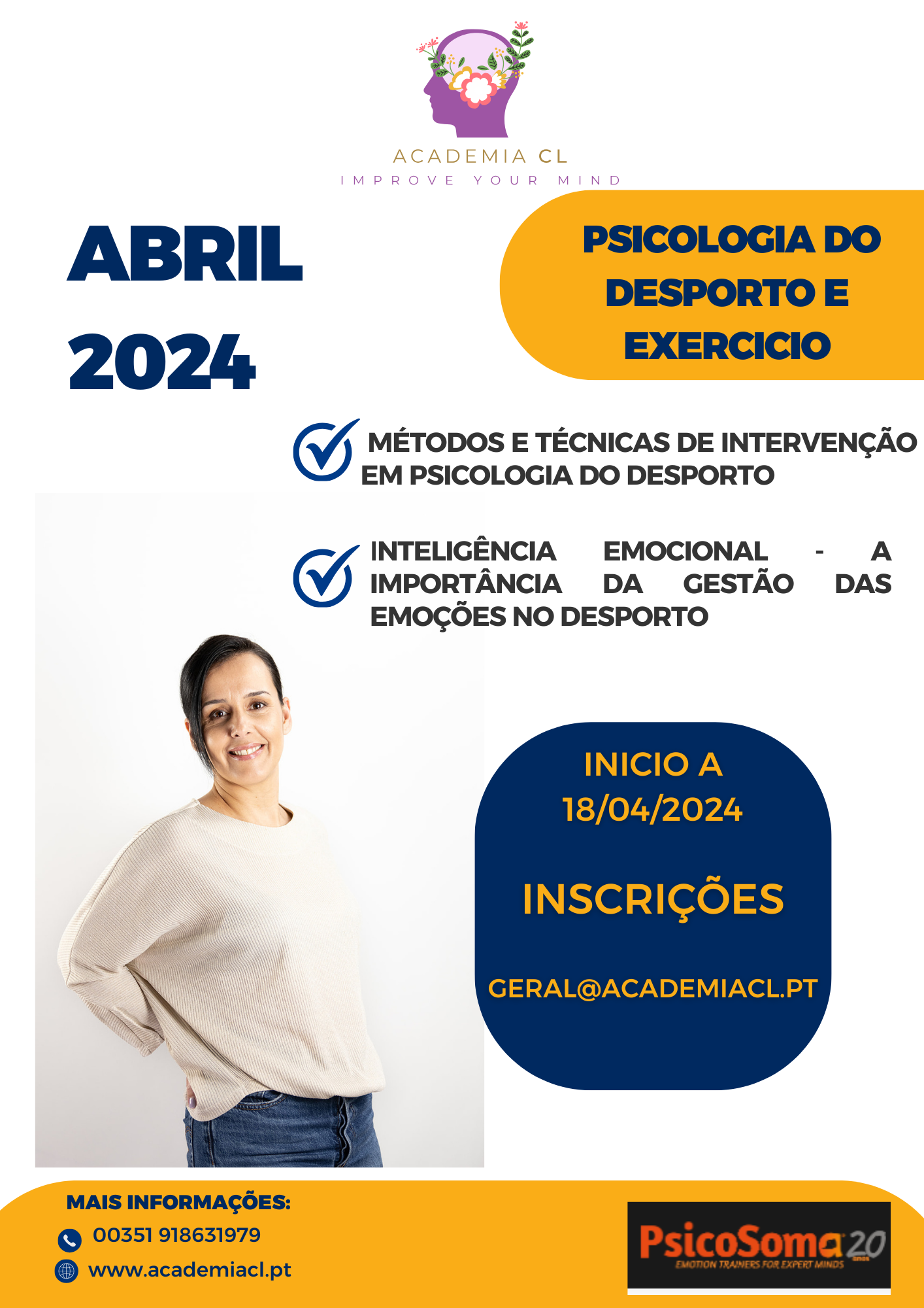 abril Date: 15 Abr, 2024 Posted by: academia Category: FORMAÇÕES FORMAÇÕES | ABRIL PSICOLOGIA DO DESPORTO E EXERCÍCIO